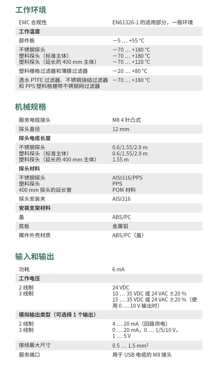 • 在 -70 °C ... +180 °C 工作温度范围内进行全量程温度补偿