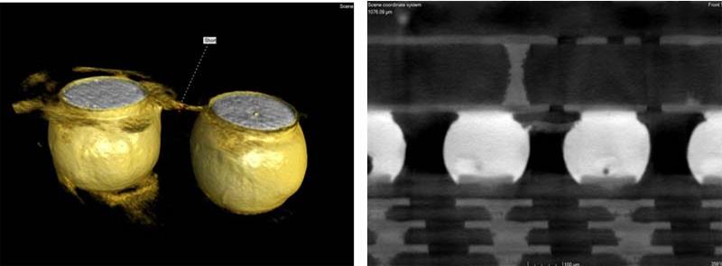 在不侵入设备的情况下,3D X 射线系统以 3D 和横截面视图显示失效位置的图像。左下角的 3D 图像表明缺陷点位于焊球处,而 3D 横截面分析则精确定位了缺陷点位于靠近 UBM 层的焊球处。