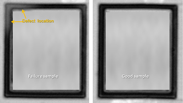 与客户审查后的初步结论表明,MEMS 组件的键合环存在错误。SAT 扫描证实了键合环分层导致了这种不稳定的 Q 值误差。