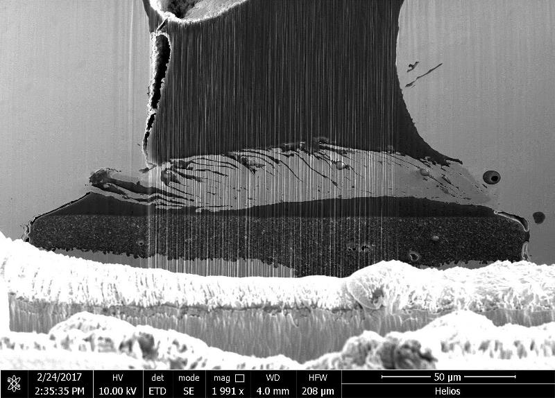 3D 设备通过对齐包装材料 (BOM) 承受更大的应力。它需要低压工具,因为当施加外力时,相邻层往往会断裂。由于传统手工磨削的应力可能导致严重损坏,因此使用低应力等离子体FIB切割出失效部分以识别原因。结果:元件的焊球之间存在 RDL 桥接(见下图)。